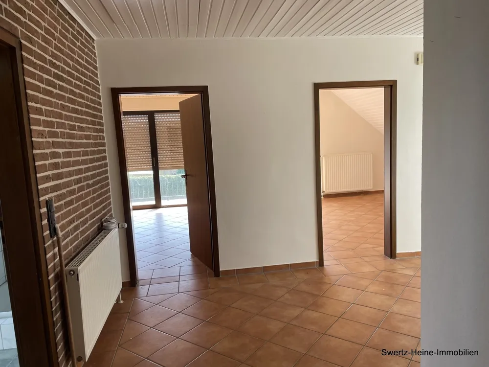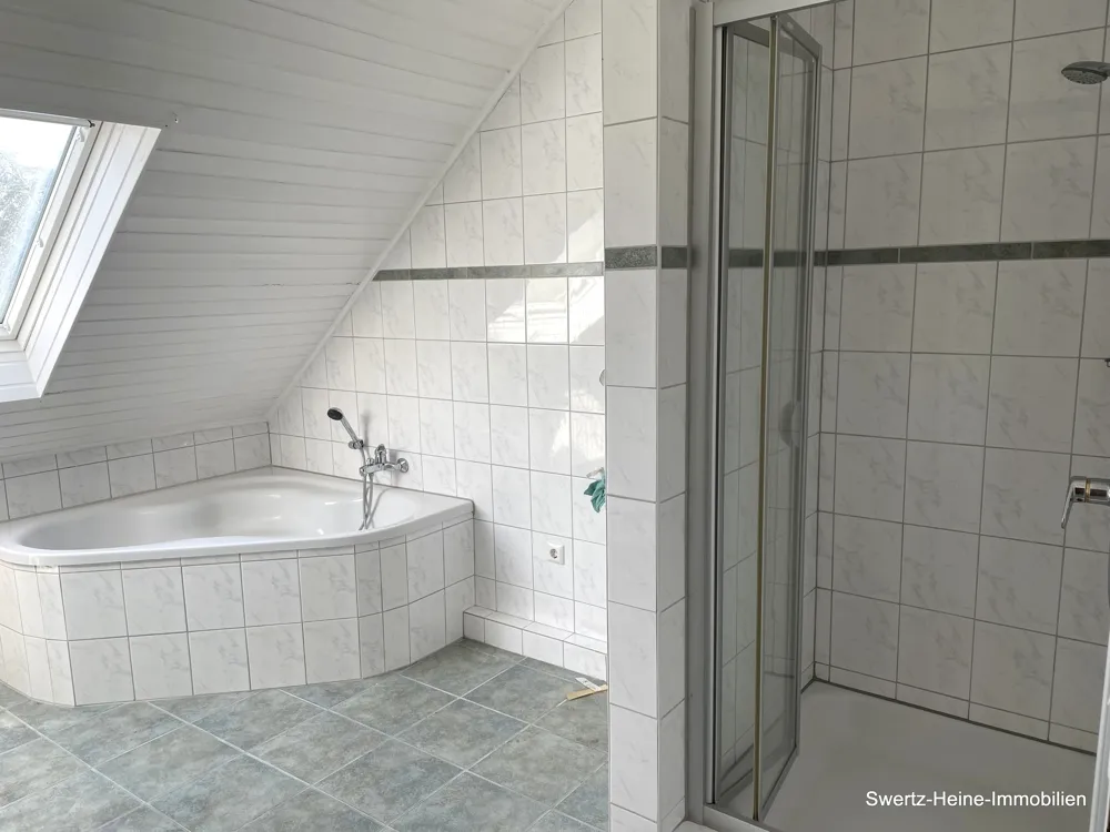 Im Obergeschoss befindet sich momentan die besagte Einliegerwohnung mit zwei Räumen, ein weiteres Bad und die große Wohnküche mit anliegendem Balkon.