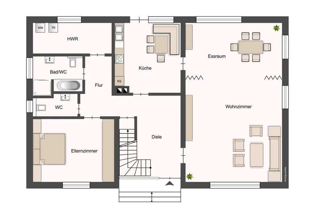 Die Gesamtwohnfläche beträgt ca. 180 m², von der ca. 120 m² auf das Erd- und ca. 60 m² auf das Obergeschoss entfallen. Das Erdgeschoss umfasst einen großzügigen Wohn- und Essbereich mit angrenzender Küche, einen Hauswirtschafsraum, zwei weitere Zimmer, Bad, Gäste-WC und eine geräumige Diele mit Treppenzugang zum OG bzw. Keller.
