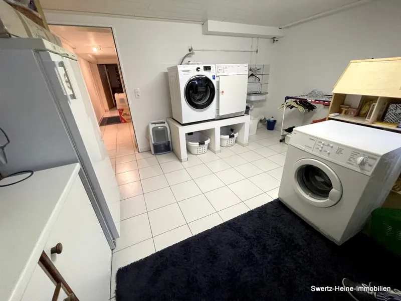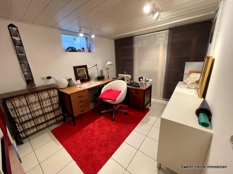 Das Kellergeschoss bietet ein vielfältig nutzbares, weiteres Zimmer - (Souterrain-Bereich), ein zweites Bad und die üblichen Nutzflächen, wie Wasch- und Vorratskeller sowie den Heizungsraum. Der an die überdachte Terrasse angrenzende und zweiseitig umlaufende Garten verfügt über eine Rasenfläche, vereinzelten Blumenrabatten im Randbereich und ist komplett eingefriedet (Sichtschutz) - vor dem Haus existiert ein kleiner, pflegeleichter Vorgarten. Eine giebelseitig angrenzende, zurückliegende Garage mit weiteren Stellplätzen davor ergänzen das Objekt.