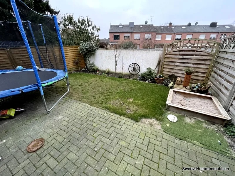 Vom Wohnzimmer gelangt man in den Garten, dieser ist komplett eingefriedet und verfügt über ein kleines Gartenhaus. Links neben dem Haus befindet sich der dazugehörige Stellplatz.