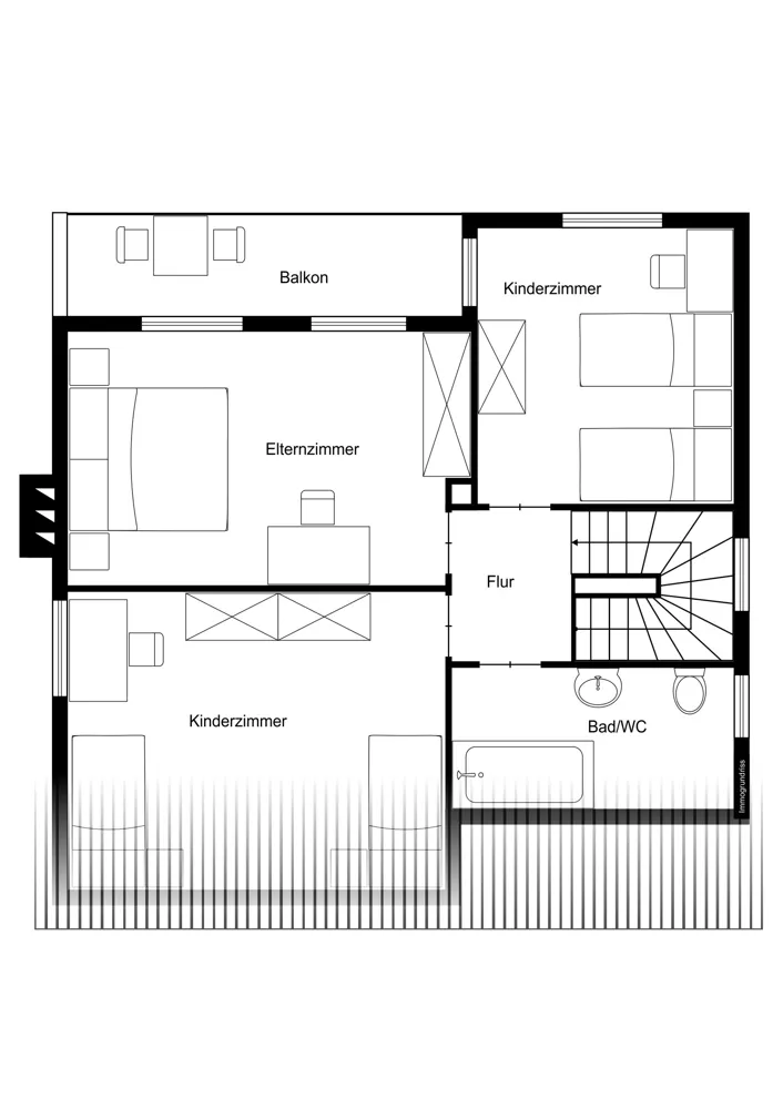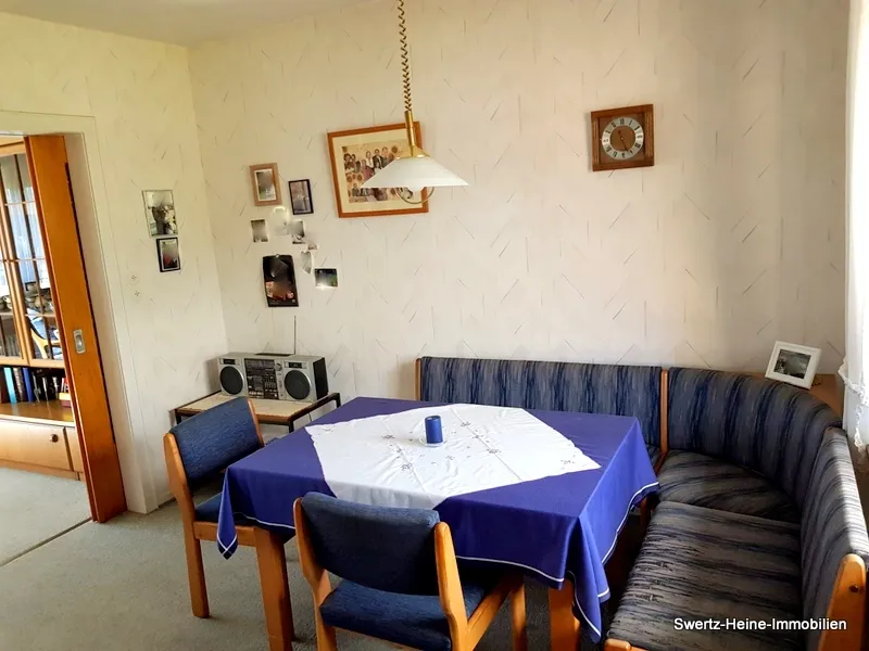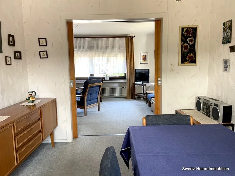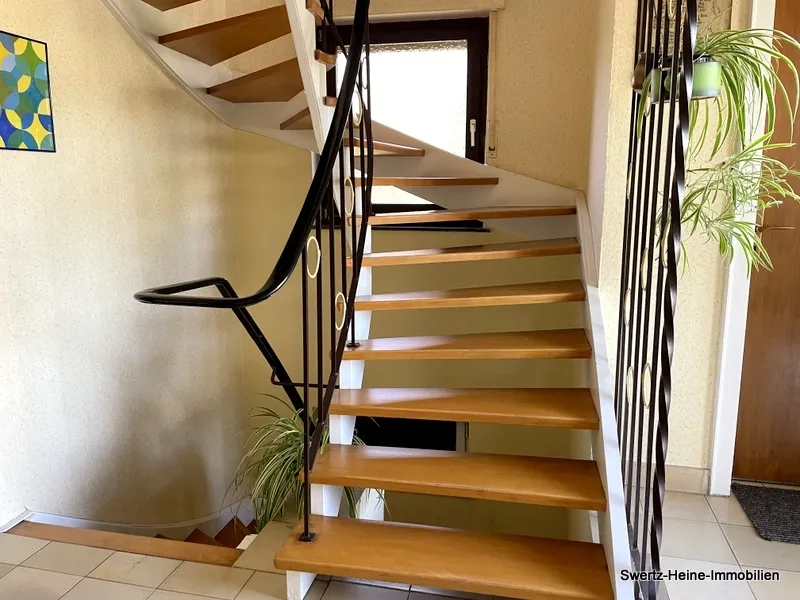 Angeboten wird hier ein freistehendes Einfamilienhaus, das 1961 auf einem ca. 712 m² großen Grundstück in Massivbauweise errichtet worden ist. Das Objekt ist komplett unterkellert und verfügt über einen seitlichen Garagenanbau. Die Wohnfläche erstreckt sich auf Erd- und Obergeschoss, verbunden sind die einzelnen Wohnebenen über eine großzügige Wendeltreppe, die vom Keller bis in das Obergeschoss führt. Den Lebensmittelpunkt des Erdgeschosses bildet der offen gestaltete Bereich des Wohn- und Esszimmers, ergänzt durch die Küche. Von der Diele aus gelangt man zusätzlich in das Gäste-WC und in ein weiteres Zimmer. In dem Obergeschoss existiert das Elternschlafzimmer, 2 Kinderzimmer, Flur und Bad. Das Badezimmer wurde vor ca. 15 Jahren renoviert.