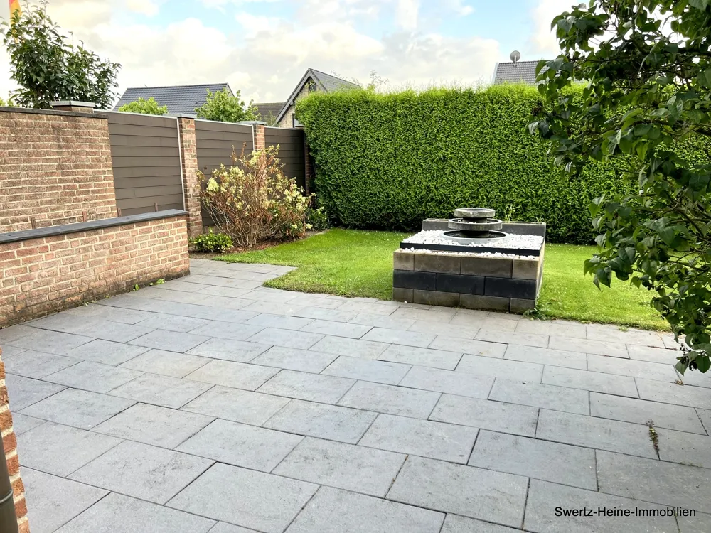 Der Gartenbereich ist komplett eingefriedet, verfügt über eine Rasenfläche, diverse Anpflanzungen und großzügige, überdachte Terrasse.