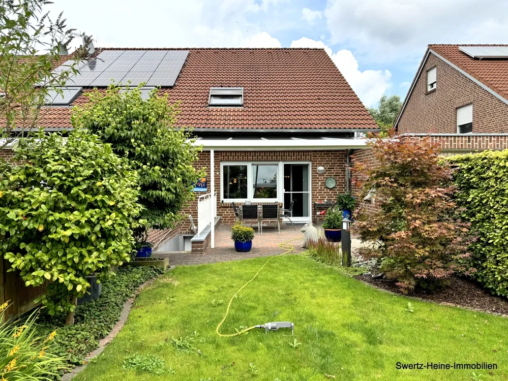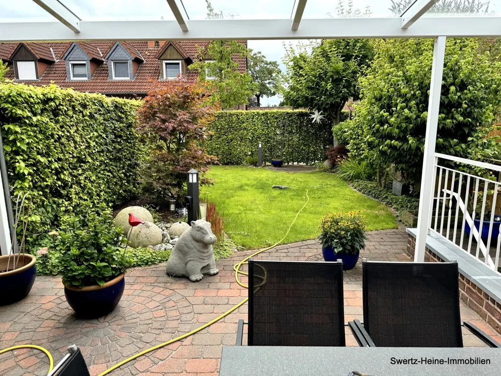 Die Terrasse ist überdacht und ist mit einer elektrischen Markise ausgestattet. Der sich anschließende Garten verfügt über eine Rasenfläche und diverse Anpflanzungen, der hintere Bereich ist über die giebelseitig angebaute Garage zugänglich.