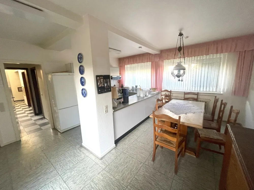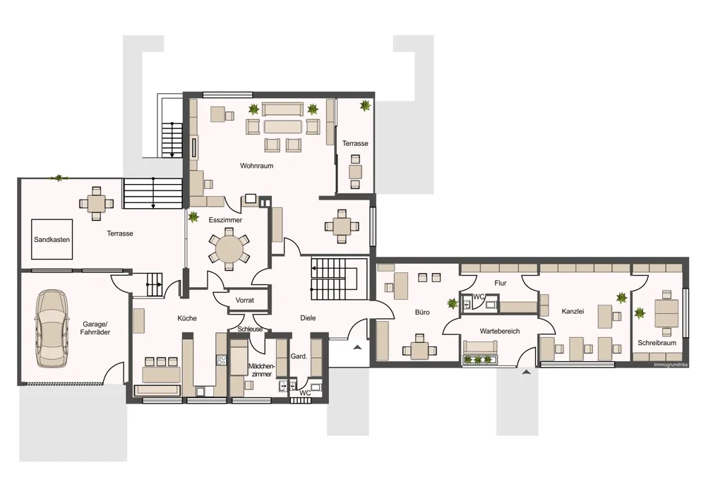 Der Grundriss des Erdgeschosses wird durch das großzügige Wohnzimmer mit Terrassen- und Gartenanbindung bestimmt, ergänzt durch das Esszimmer und Küche (inkl. Abstellraum); von hier aus ist zusätzlich eine zweite Terrassenfläche zugänglich. Alle Räumlichkeiten sind über die Diele mit Treppenauf- und Abgang zu erreichen, dies gilt auch für das Gäste-WC und einem weiteren Raum; von der Diele aus existiert auch eine Verbindung zum Anbau (Bürotrakt), der zusätzlich über einen separaten Eingang verfügt.
