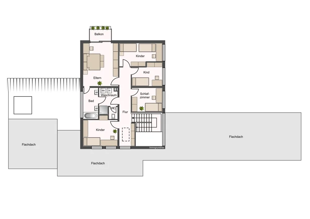 Das Obergeschoss umfasst 5 Zimmer (Schlaf- und Kinderzimmer), 2 Bäder und ein separates WC.