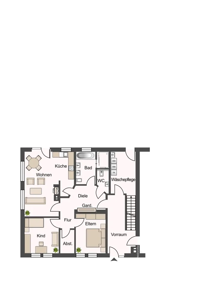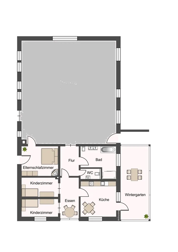Im Hauptgebäude befinden sich zwei getrennte Wohneinheiten. Alle Bereiche sind bereits in Teileigentum aufgeteilt, wodurch eine klare Struktur und eine saubere Zuordnung der jeweiligen Innen‑ und Außenflächen gewährleistet ist. Jede der beiden großen Einheiten verfügt über zwei eigene Garagen und einen zugeordneten Außenbereich, der ausreichend Platz für individuelle Gestaltungsideen bietet.