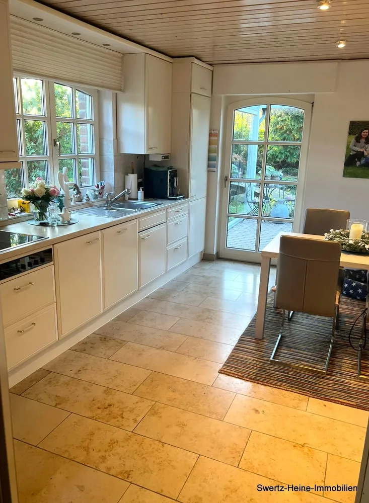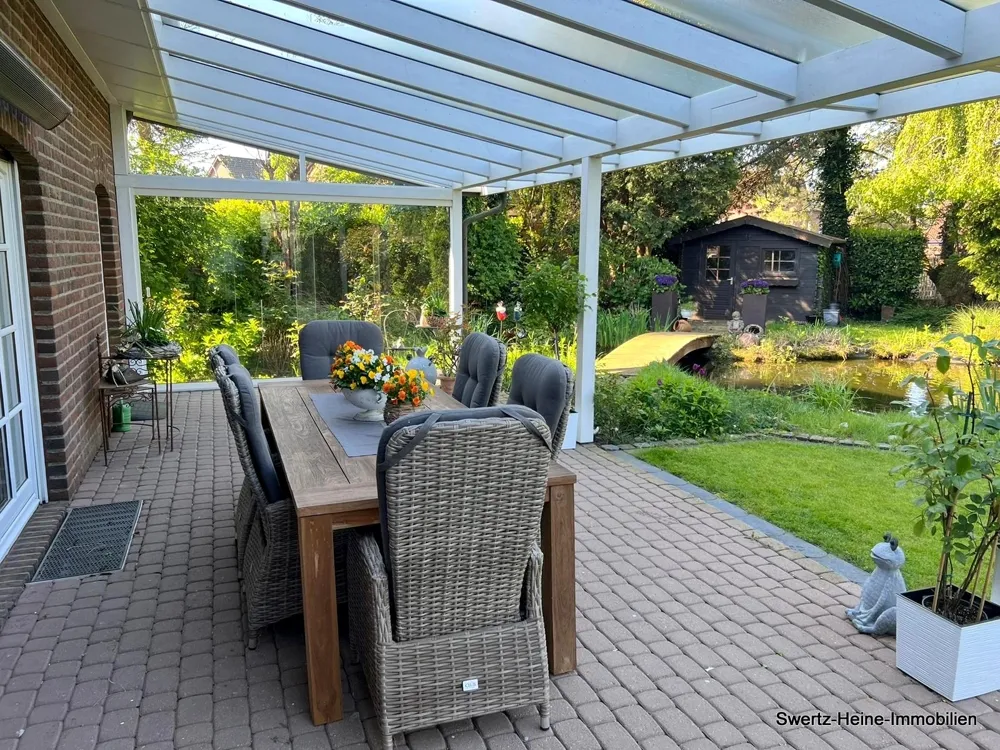 Den Mittelpunkt des Erdgeschosses bildet das großzügige Wohn- und Esszimmer mit angrenzender Küche, eine geräumige Diele mit Eingangsbereich, WC (im Jahr 2022 erneuert und mit einer Dusche erweitert) und die entsprechenden Treppenauf- und Abgänge. Eine überdachte Terrasse mit Beschattungseinrichtung erstreckt sich über die gesamte hintere Hausbreite und schafft so einen zusätzlichen Wohlfühlbereich (aus dem Jahr 2008). Bodennahe Fenster- und Türelemente sorgen hier für einen entsprechenden Lichteinfall in Wohn-/Esszimmer und der Küche.