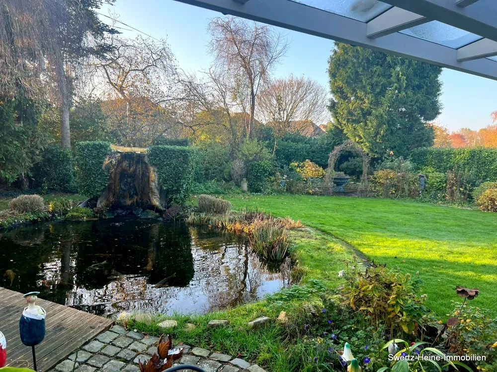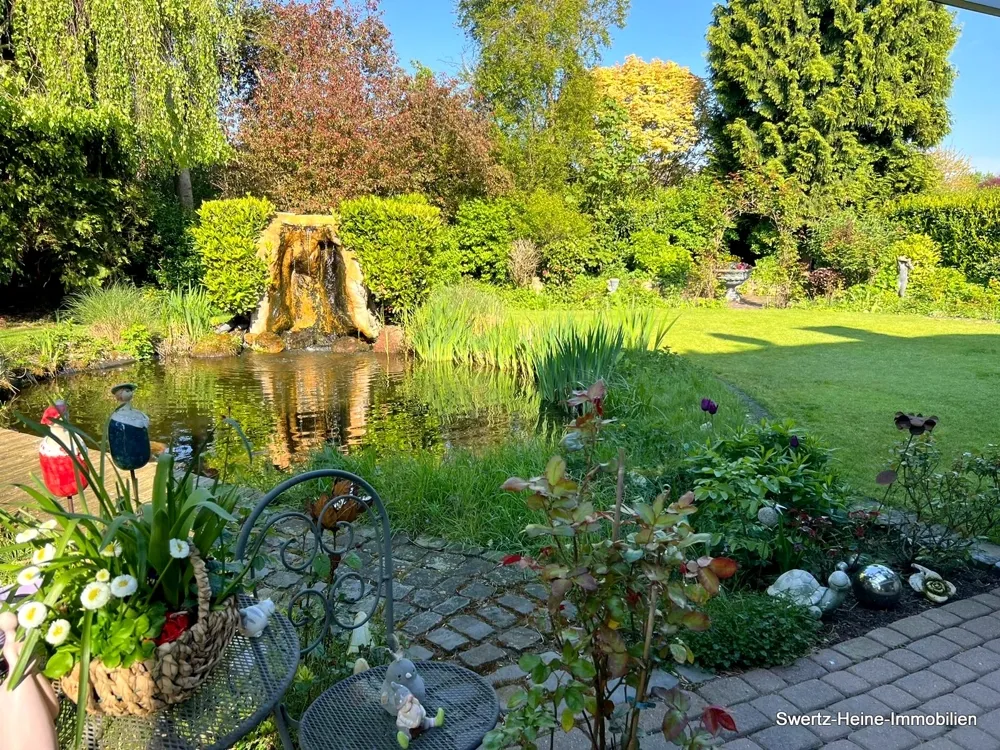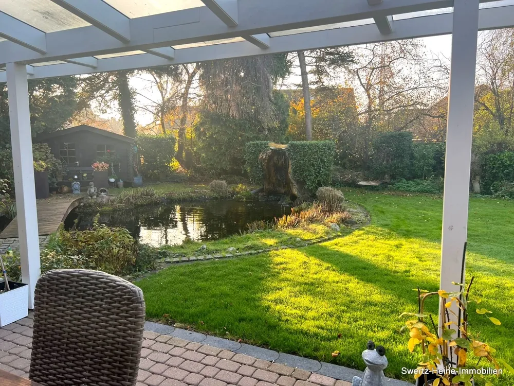 Das Kellergeschoss verfügt über entsprechende Nutzflächen, wie Vorrats- und Waschkeller, Heizungskeller, einen Außenzugang zum Garten und über einen Saunabereich. Beheizt wird das Haus über eine neue Gasheizung aus dem Jahr 2020. Eine giebelseitig angebaute Doppelgarage vervollständigt den Baukörper. Der ebenfalls sehr liebevoll gestaltete Außenbereich verfügt über einen kleinen Vorgarten mit niedrigen Anpflanzungen sowie über den nach hinten ausgerichteten Hauptgarten mit Rasenfläche, höheren Randbepflanzung, einer Wasserfläche (Teich) und der bereits angesprochenen Terrassenfläche.