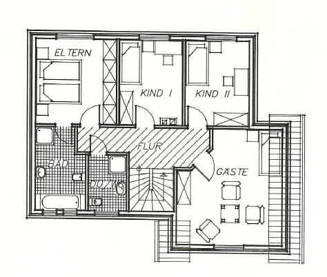 Eine Massivholztreppe führt in das Obergeschoss, dies verfügt ursprünglich über 3 Kinderschlafzimmer mit einem separaten Badezimmer und dem Elternschlafzimmer mit angrenzendem Bad. Aktuell wurde ein Kinderzimmer als Ankleidezimmer zum Elternschlafzimmer umfunktioniert.