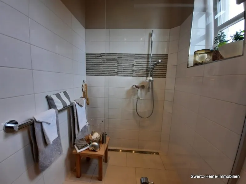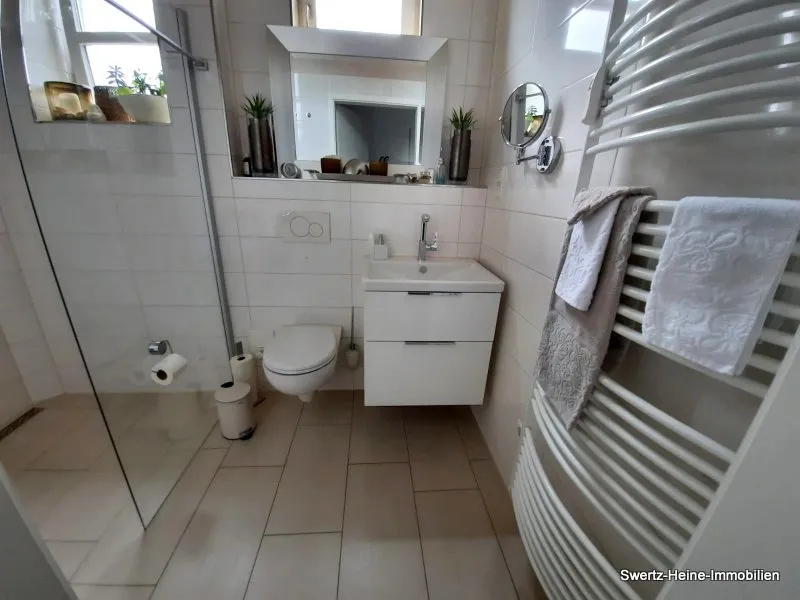 Das Badezimmer im EG verfügt über eine Dusche und das Badezimmer im OG über eine Badewanne.