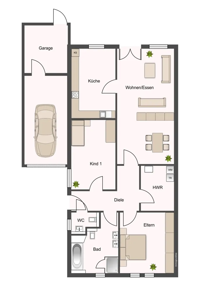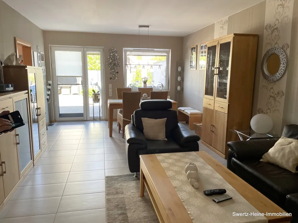 'Wohnen auf einer Ebene' - alle damit verbundenen Vorteile bietet ihnen der hier angebotene Bungalow, der im Jahr 2012 in Massivbauweise auf einem ca. 300 m² großen Grundstück errichtet worden ist. Das Objekt verfügt über ein geräumiges Wohn- und Esszimmer mit angrenzender Küche, zwei Schlafzimmern, Bad, Gäste-WC, Diele und über einen Hauswirtschaftsraum. Der Hauseingang befindet sich im seitlichen Bereich der Garagenzufahrt, diese verfügt im hinteren Teil zusätzlich über einen integrierten Abstellraum mit Zugang zum Garten. Weiterer Stauraum existiert unterhalb der Dachfläche, der über eine Ausziehtreppe von der Diele aus genutzt werden kann.