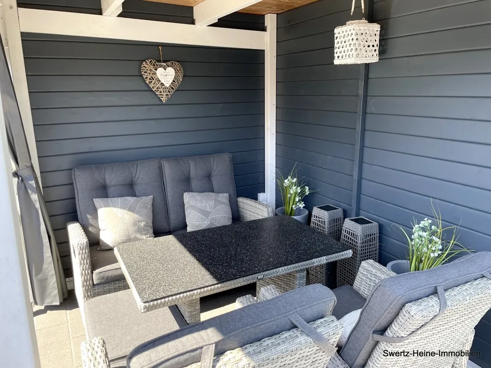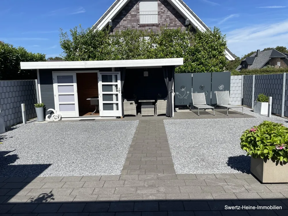 Ein nach hinten ausgerichteter und sehr liebevoll gestalteter, komplett eingefriedeter Garten mit mannshoher Hecke, vereinzelten Baumanpflanzungen, gepflasterter Terrasse und Gartenhaus vervollständigen dieses sehr gepflegte und neuwertige Gesamtobjekt - hier trifft der Slogan zu 'Einziehen und Wohlfühlen' !