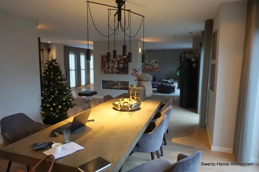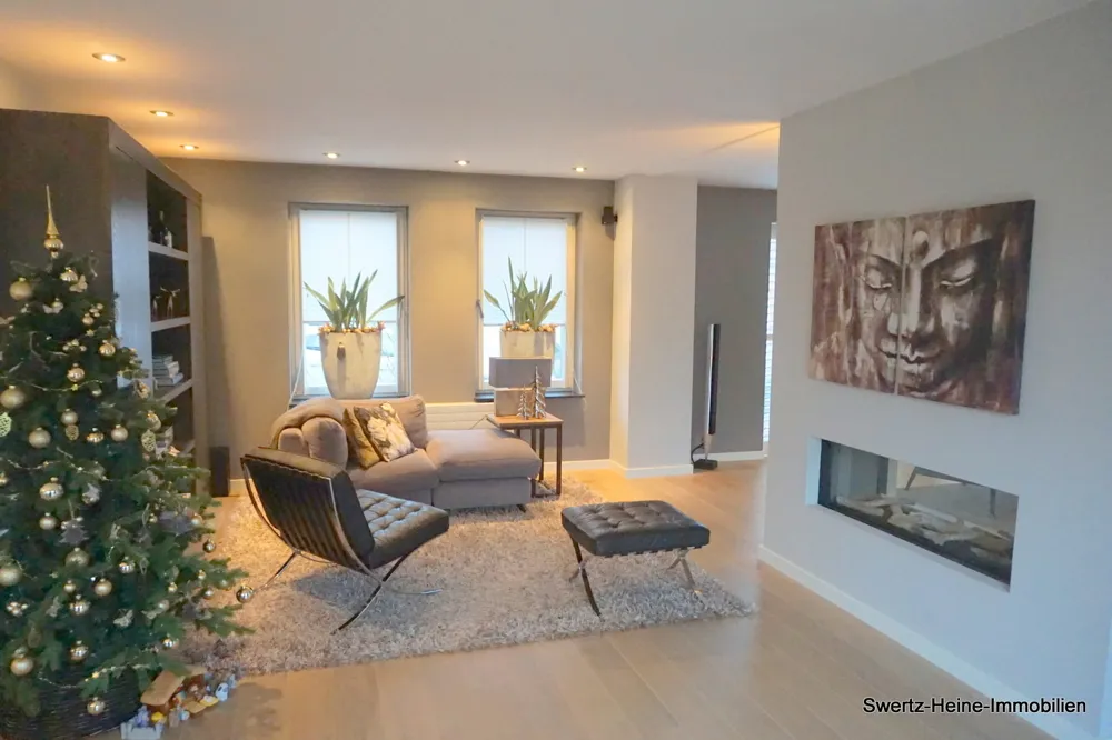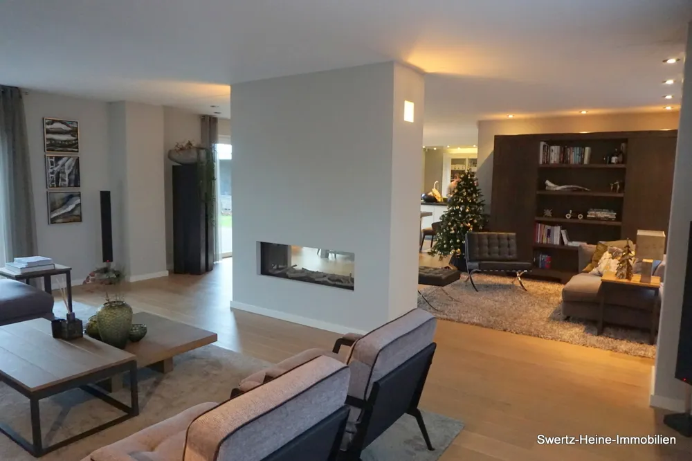 Im Wohnbereich ist im Übergang vom ursprünglichen Teil zu der Erweiterung ein moderner, zentral steuerbarer Gaskamin als optischer Raumteiler installiert, die Küche ist offen gestaltet.