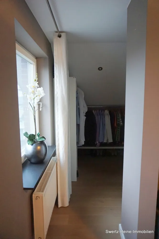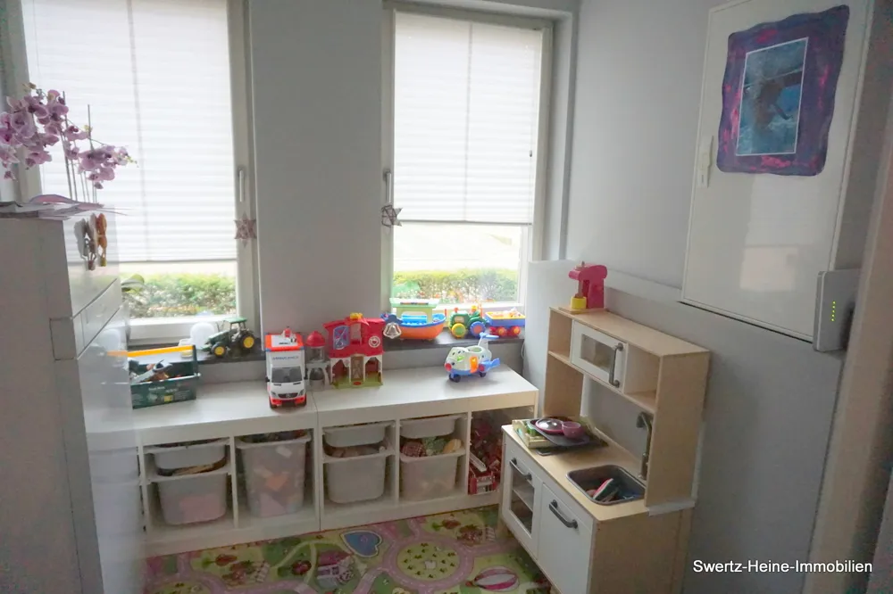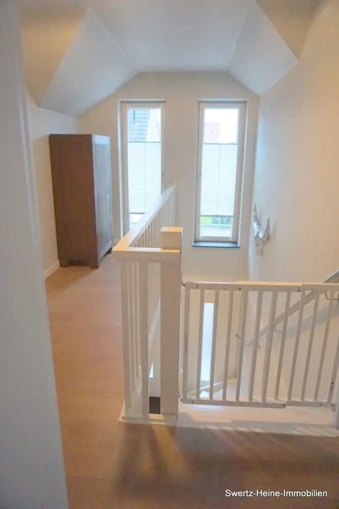 So sorgen z.B. in dem großzügigen Wohnbereich des Erdgeschosses die z.T. bodennah ausgelegten Fenster- und Türelement für sehr viel Lichteinfall und ein helles, freundliches Ambiente; die Fenster bestehen aus Kunststoffrahmen und sind in creme-weißer Holzoptik ausgelegt, verfügen alle über Dreh- / Kippfunktionen, teilweise über Fliegengitter und sind mit innenliegenden Holzjalousinen versehen. Die Böden sind, bis auf die Nassräume, mit hochwertigen Eichenvollparkett (3 cm) ausgelegt und die Treppe zum Dachgeschoss besteht aus Massivholz.