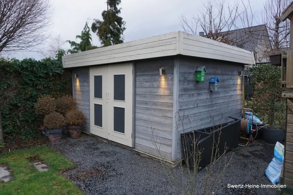 Der sehr schön gestaltete Gartenbereich ist durch einen umlaufenden, mannshohen Sichtschutz nicht einsehbar, verfügt über eine großzügige, überdachte Lounge (5,75 x 7,75 m), große Terrassenfläche, über ein modernes Holz-Gartenhaus sowie über eine kleine Rasenfläche bzw. über diverse kleinere Anpflanzungen. Dieser Garten bietet alles, um sich auch im Freien wohlzufühlen.
