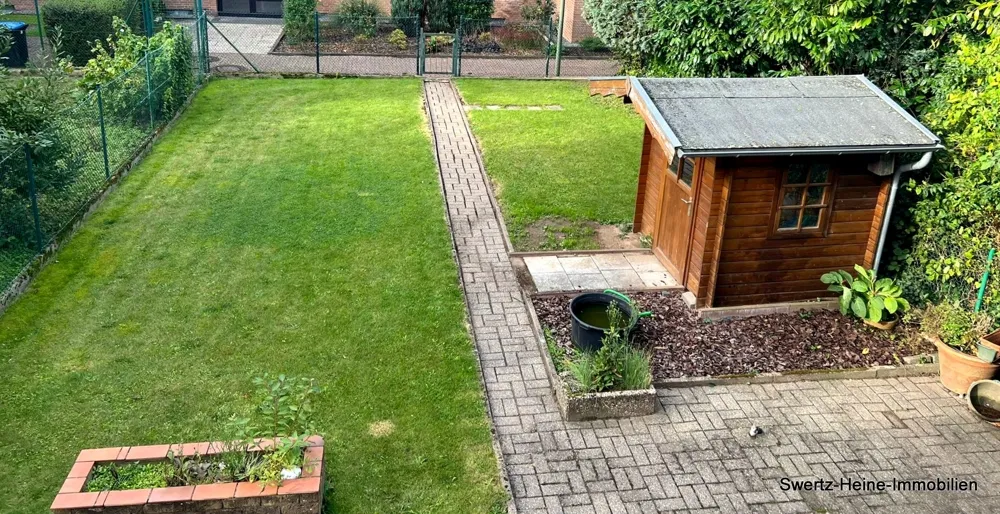 Über das Esszimmer im Erdgeschoss gelangt man auf die Terrasse, hieran schließt sich der hintere und komplett eingefriedete Gartenbereich an, bestehend aus Rasenfläche und Pflanzrabatten - hier befindet sich zusätzlich ein massives Gartenhaus.