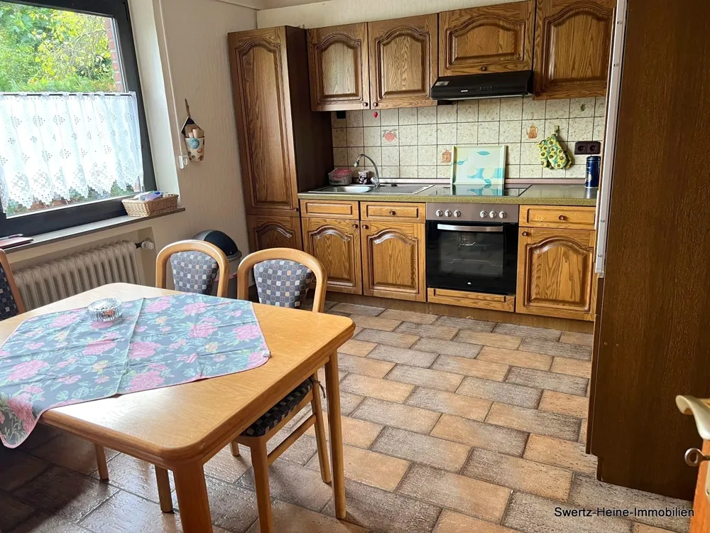Die Wohnfläche von ca. 115 m² verteilt sich im Erdgeschoss auf Wohn- und Esszimmer, Küche, Diele und Gäste-WC. Im Obergeschoss existieren 3 weitere Räume und ein Bad mit Dusche und Badewanne, das Dachgeschoss verfügt über weitere Nutzfläche.