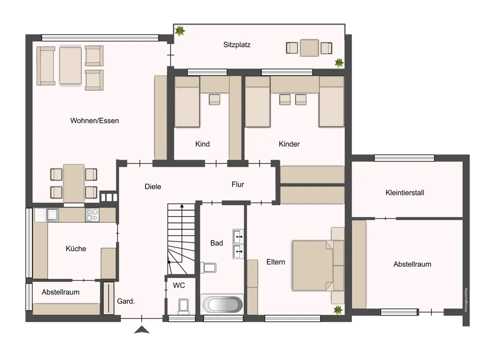 Im Kellergeschoss befinden sich die notwendigen Nutzflächen mit Waschkeller, Lager- und Abstellflächen bzw. Hobby- und Werkzeugkeller.